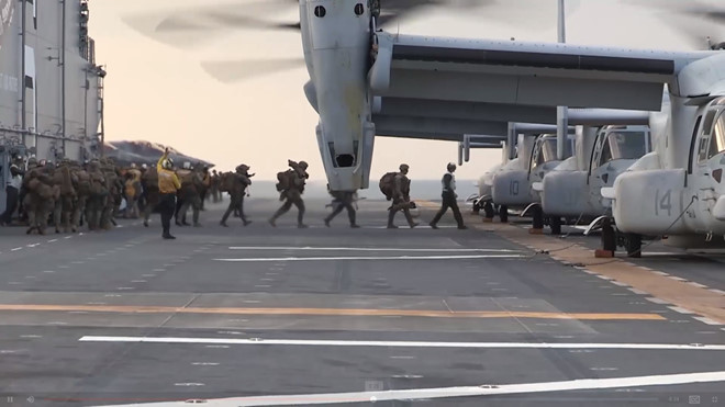Trong đó, nội dung tập trận của Nhóm tác chiến tàu sân bay USS Theodore Roosevelt và Nhóm tác chiến viễn chinh USS America trên Biển Đông hồi giữa tháng 3 đã được hé lộ thông qua video clip dài 52 giây do quân đội Mỹ công bố. Theo đó, ngoài việc triển khai chiến đấu cơ F-35 uy lực, thì Mỹ cũng tập luyện cả khả năng dùng máy bay lưỡng dụng Osprey V-22 (có thể cất hạ cánh thẳng đứng như máy bay trực thăng và bay như máy bay phản lực) để chở theo binh sĩ thủy quân lục chiến, hải quân thực hiện đổ bộ lên đảo. Tốc độ lên đến 500 km/giờ và bán kính chiến đấu lên đến 700 km, loại máy bay này là phương tiện hành quân khẩn cấp linh hoạt nhất hiện nay. Tàu USS America hiện đang mang theo máy bay Osprey V-22. Nếu Osprey V-22 giúp đổ bộ đường không, thì tàu đệm khí do tàu vận tải đổ bộ lớp San Antonio lại trở thành phương tiện đổ bộ đường biển. Tàu lớp San Antonio vừa qua cũng hiện diện trên Biển Đông.