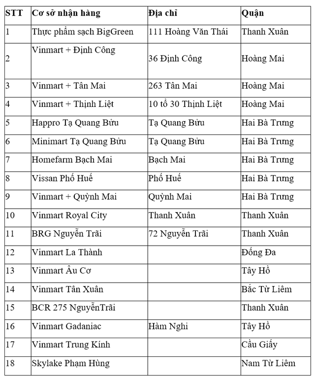 Trong đó, 8 siêu thị VinMart tại các quận Thanh Xuân, Hà Đông, Cầu Giấy, Hoàng Mai và Long Biên. Còn 15 cửa hàng VinMart +, gồm 8 cửa hàng tại Hà Nội, tập trung tại quận Hai Bà Trưng, Hoàng Mai và huyện Thanh Trì. 7 cửa hàng VinMart+ còn lại tại huyện Văn Giang, tỉnh Hưng Yên.