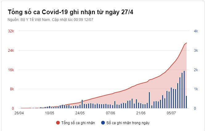 Tính đến sáng 12/7, Việt Nam có tổng cộng 28.551 ca ghi nhận trong nước và 1.927 ca nhập cảnh. Số lượng ca mắc mới ghi nhận trong nước tính từ ngày 27/4 đến nay là 26.981 ca, trong đó có 6.501 bệnh nhân đã được công bố khỏi bệnh.