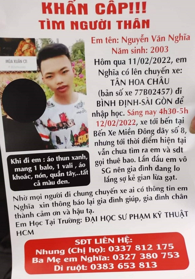 Nghĩa đón xe khách Tân Hoa Châu từ huyện Tây Sơn vào TP HCM. Khoảng 5 giờ sáng 12-2, xe khách Tân Hoa Châu đến Bến xe Miền Đông thì gia đình không liên lạc được với Nghĩa.