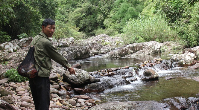 Vừa đi “người rừng” Cam Văn Nghĩa vừa tìm kiếm ong ở các khe nước. Nắng mỗi lúc một gay gắt hơn, đi được đoạn dài người ai cũng ướt sũng mồ hôi mà bước chân dân bản địa cứ thoăn thoắt trèo qua những tảng đá lớn bám rong rêu trơn tuột.