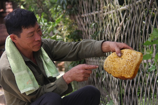 | Nhờ nghề săn ong khoái, anh Nghĩa đã dành dụm được chút vốn liếng để dựng căn nhà mới và tính đến chuyện cưới vợ cho con trai lớn. Anh xởi lởi đem mấy miếng sáp ong đầy mật, vàng rực mời tôi thưởng thức thành quả của một chặng đường dài, chưa hiểu bổ béo đến đâu nhưng thực sự độ sánh quyện và thơm ngon thì quả thật hơn hẳn mật ong nuôi. |