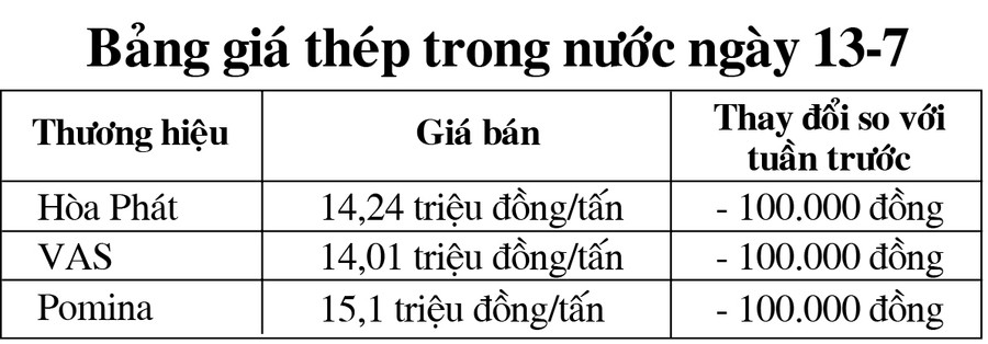 Trong khi đó, từ ngày 5-7, giá thép trong nước tiếp tục được các doanh nghiệp điều chỉnh giảm 100.000 đồng/tấn đối với dòng thép thanh vằn D10 CB300.