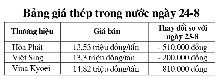 Báo Kinh tế và Đô thị cho hay, Hiệp hội Thép Việt Nam (VSA) nhận định giá thép trong nước có khả năng sẽ tiếp tục hạ trong thời gian tới. Nguyên nhân được cho là thị trường bất động sản chưa có tín hiệu phục hồi, một vài dự án nhà ở xã hội trên cả nước cũng chỉ mới được triển khai, các dự án đầu tư công vẫn chưa khởi sắc. Bên cạnh đó, tháng 7 âm lịch được cho là “ác mộng” đối với ngành Xây dựng khi hầu như không có dự án mới nào động thổ. Điều này kéo theo tiêu thụ thép giảm mạnh.