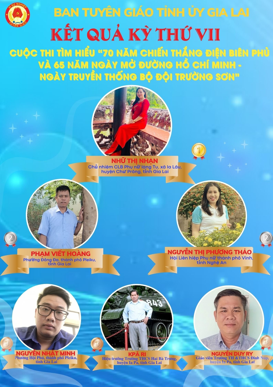 Theo đó, giải nhất thuộc về thí sinh Nhữ Thị Nhạn-Chủ nhiệm Câu lạc bộ Phụ nữ làng Tu (xã Ia Lâu, huyện Chư Prông); giải nhì thuộc về 2 thí sinh Phạm Viết Hoàng (phường Đống Đa, TP. Pleiku) và Nguyễn Thị Phương Thảo-Hội Liên hiệp phụ nữ TP. Vinh (tỉnh Nghệ An); 3 thí sinh: Nguyễn Nhật Minh (phường Hội Phú, TP. Pleiku), Kpă Ri-Hiệu trưởng Trường THCS Hai Bà Trưng (huyện Ia Pa) và Nguyễn Duy Ry-Giáo viên Trường Tiểu học và THCS Đinh Núp (huyện Ia Pa) đạt giải ba. Ban tổ chức cũng xét công nhận 10 thí sinh đạt giải khuyến khích tại kỳ thi.