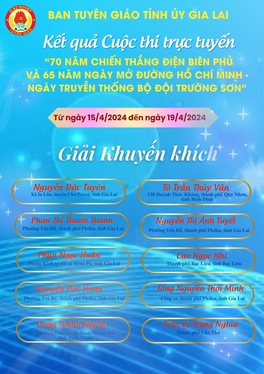 Kỳ thi thứ 8 của cuộc thi bắt đầu từ lúc 9 giờ ngày 22-4 và kết thúc vào 16 giờ ngày 26-4 tại địa chỉ: https://thongtintuyengiao.gialai.org.vn/Cuoc-thi-BTG/Cuoc-thi-truc-tuyen.