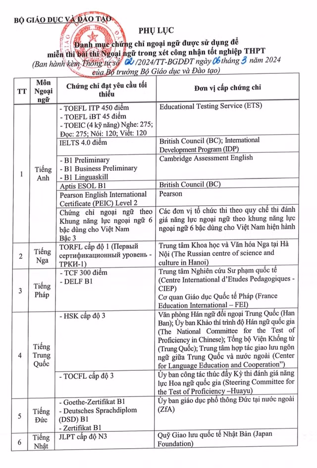 Bộ GD-ĐT cũng công bố danh mục chứng chỉ ngoại ngữ được sử dụng để miễn bài thi ngoại ngữ trong xét công nhận tốt nghiệp THPT.