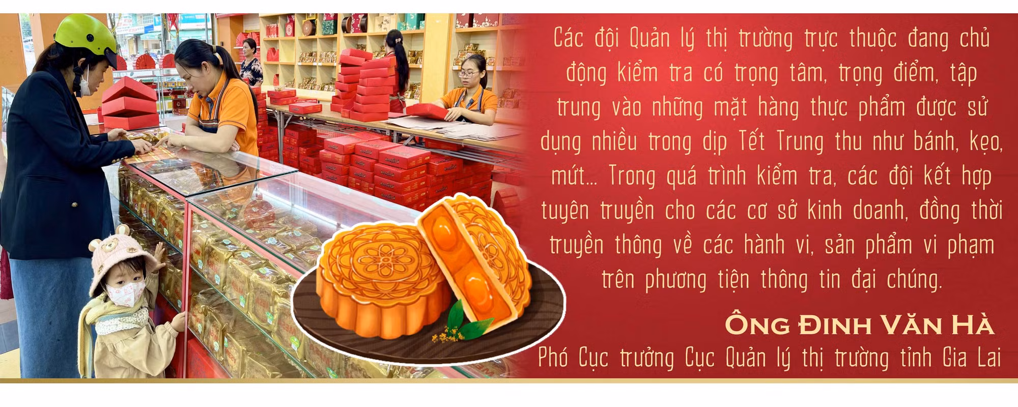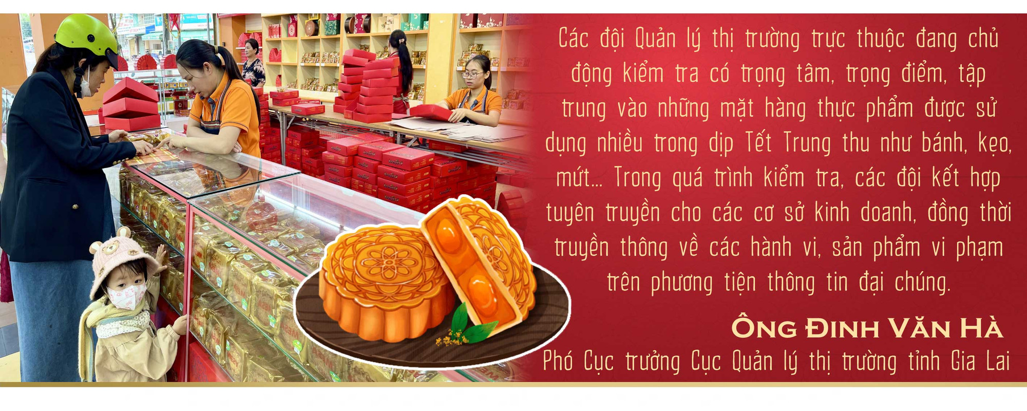 “Vừa qua, Đội Quản lý thị trường số 1 đã phát hiện cơ sở kinh doanh của bà Bùi Thị Thu Hiền (xã Biển Hồ, TP. Pleiku) kinh doanh 3.200 cái bánh Trung thu không rõ nguồn gốc xuất xứ. Toàn bộ số bánh trên được đóng kín trong bì ni lông, trên nhãn từng bì ghi chữ tượng hình; trên sản phẩm hàng hóa và tài liệu kèm theo không có căn cứ xác định nơi sản xuất hoặc xuất xứ của hàng hóa. Đoàn kiểm tra đã tiến hành lập biên bản và tịch thu toàn bộ số hàng hóa trên và xử phạt chủ cơ sở 12 triệu đồng”-ông Hà thông tin.