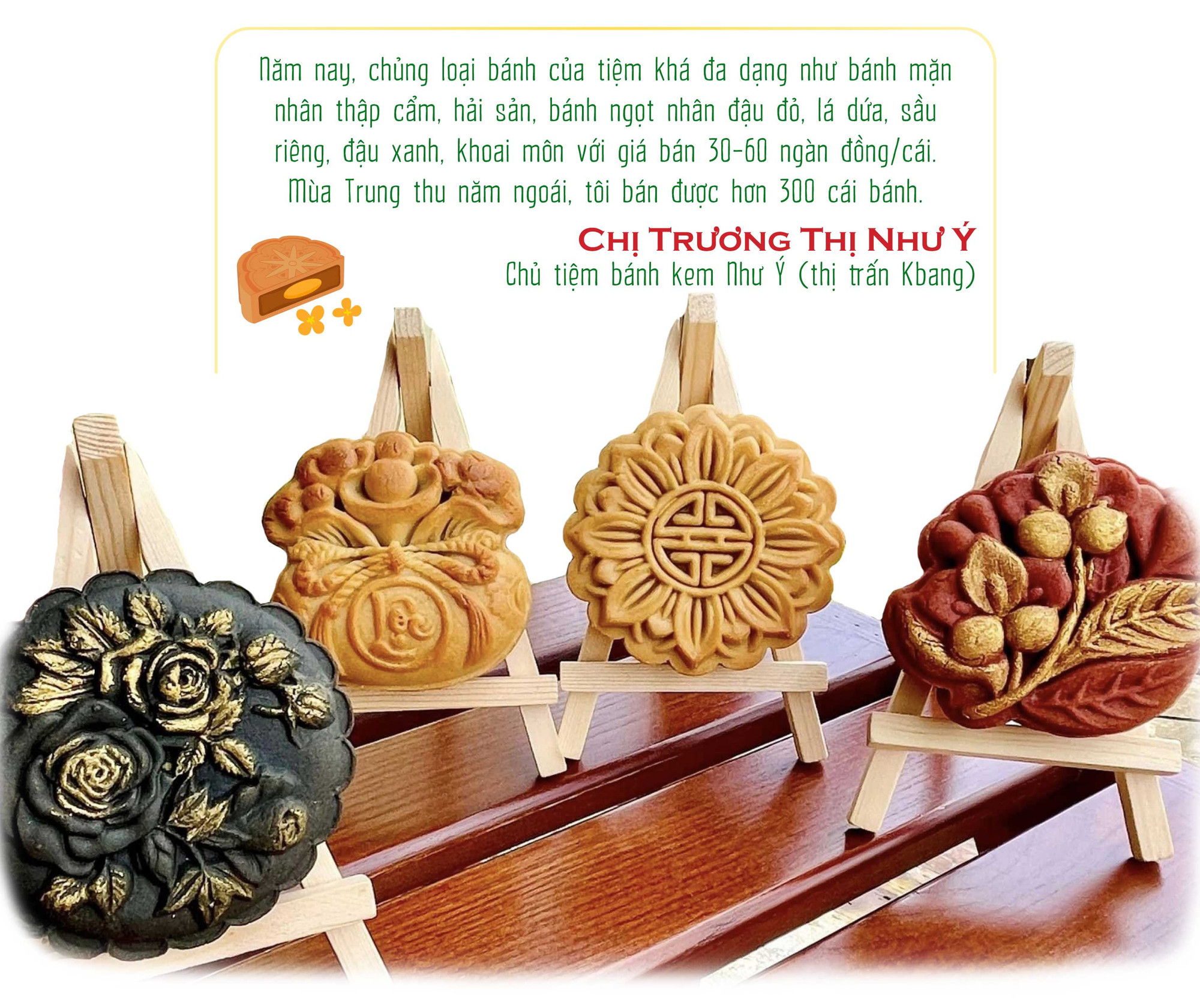 Thời điểm này, thị trường bánh Trung thu bắt đầu nhộn nhịp. Một số cơ sở nhỏ trên địa bàn tỉnh đã bắt tay vào sản xuất bánh. Chị Trương Thị Như Ý-Chủ tiệm bánh kem Như Ý (thị trấn Kbang) chia sẻ: “Mỗi dịp Tết Trung thu, tôi đều làm thêm bánh nướng, bánh dẻo nhằm đáp ứng nhu cầu tiêu dùng của người dân. Vì bánh không có chất bảo quản, hạn sử dụng khoảng 20 ngày nên tôi thường làm từng ít một, bán hết mới làm tiếp. Làm như vậy bánh sẽ luôn giữ được độ mềm dẻo, thơm ngon”.