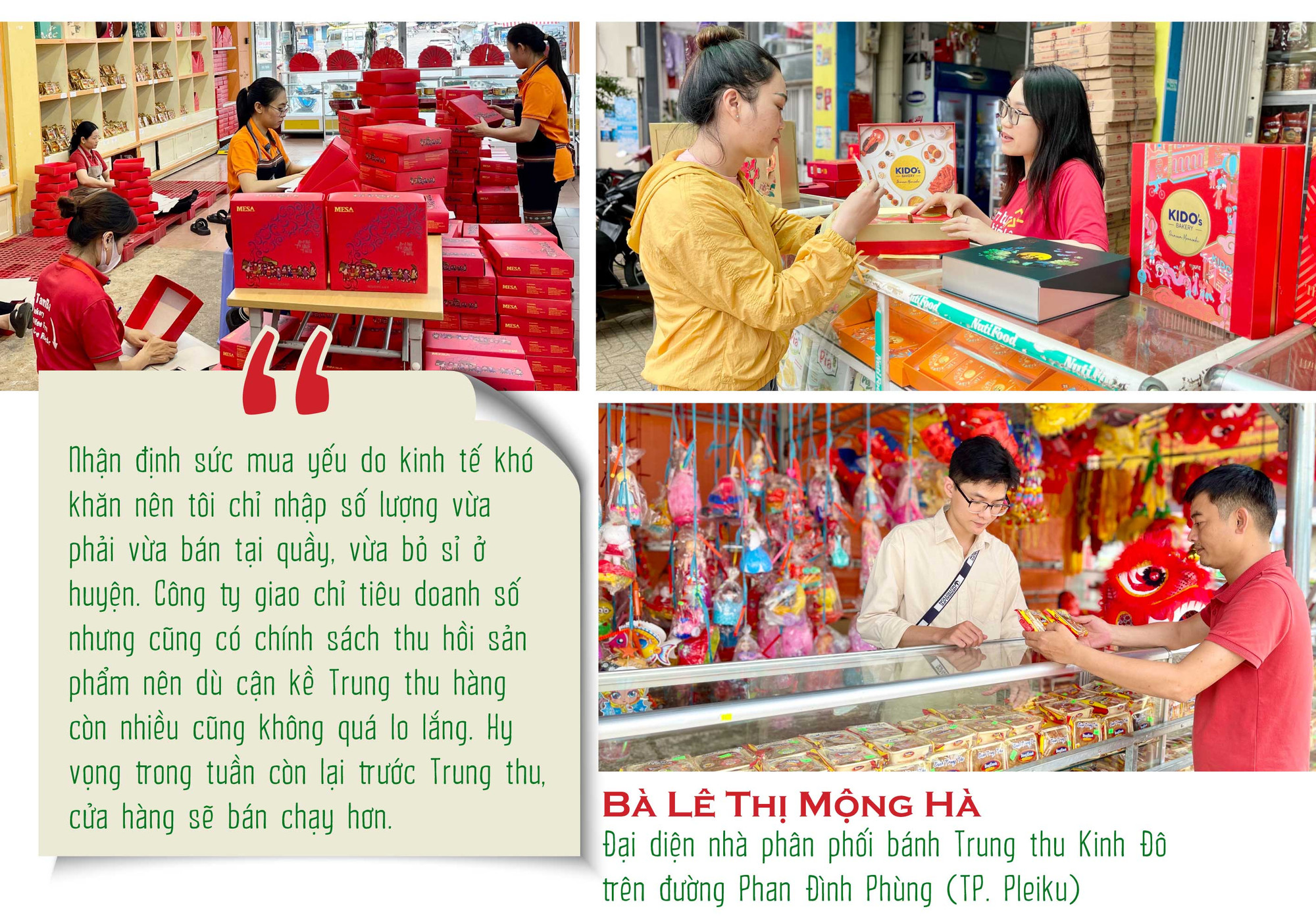 Tại quầy bánh Trung thu Kinh Đô trên đường Phan Đình Phùng (TP. Pleiku) của nhà phân phối Hà Nam, lượng khách bắt đầu tăng trong vài ngày qua. Bà Lê Thị Mộng Hà-đại diện nhà phân phối-cho hay: Năm nào Kinh Đô cũng đổi mới, đa dạng các dòng bánh. Ngoài các dòng bánh bình dân có giá 58-95 ngàn đồng/cái, Kinh Đô còn có một số dòng cao cấp như: hộp bánh Trăng Vàng, Trăng Vàng Black&Gold có giá từ 640 ngàn đồng đến 5 triệu đồng/hộp. Năm nay, giá bánh tăng khoảng 10%.