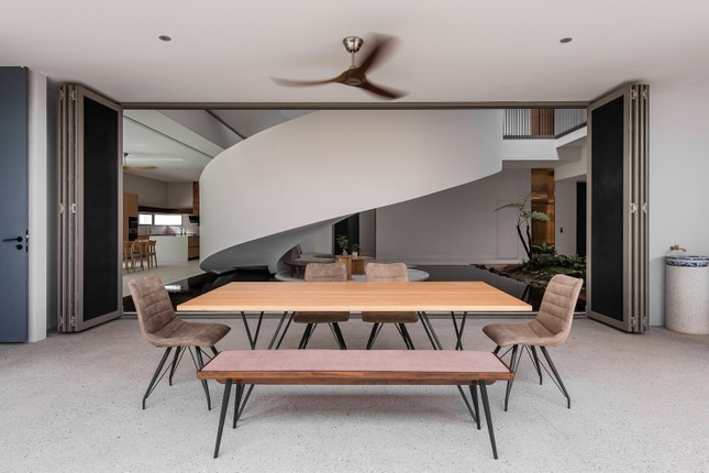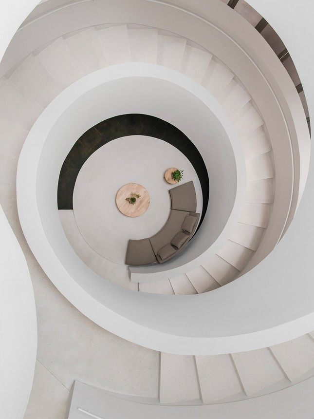 Thiết kế tập trung các không gian công năng quanh chiếc cầu thang xoắn ốc ở trung tâm.