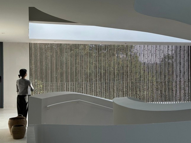 Bổ sung cho giếng trời trung tâm, các giếng trời phụ được sử dụng ở khu vực khác của biệt thự, kết hợp với các khe thông gió và màn nhôm đục lỗ để thông gió chéo, ánh sáng và không khí trong căn biệt thự luôn vừa vặn để chủ nhà thư giãn.