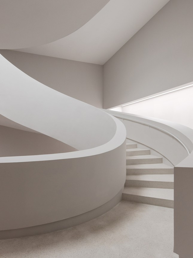 Đường nét to lớn nhưng mềm mại và hoàn hảo như một tác phẩm điêu khắc thạch cao. Khi kết hợp với ánh sáng tán xạ qua giếng trời, màu trắng ngọc trai của cầu thang trở nên dịu nhẹ và bay bổng, tạo cảm giác như đây là "những nấc thang lên thiên đường".