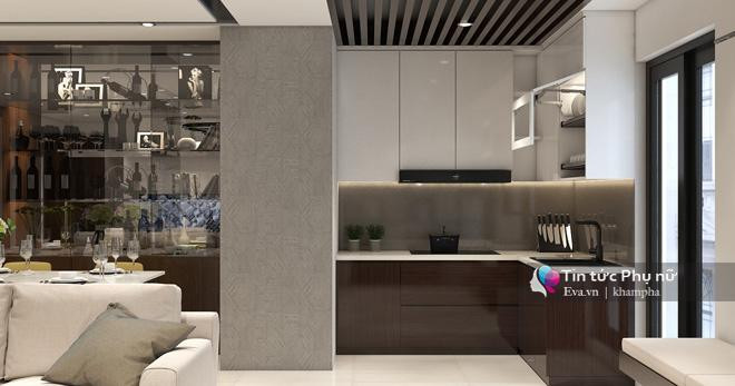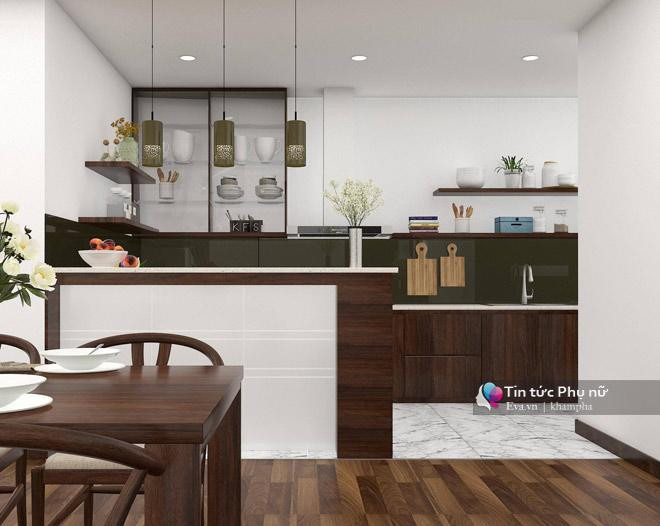 Khu vực bếp nấu nhìn từ góc đọc sách. Bếp được thiết kế hiện đại với nội thất gỗ màu nâu trầm sạch sẽ, cá tính.