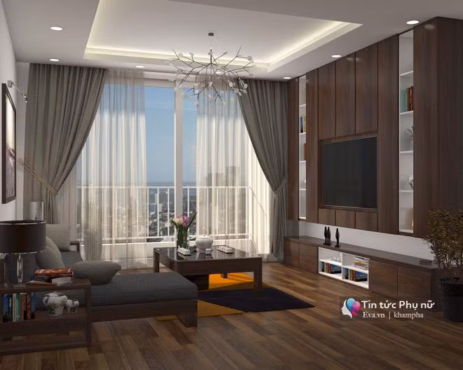 Phòng khách được thiết kế gần ban công nên khắc phục được độ tối, trầm của nội thất gỗ. Ngoài ra, đèn trần hay kệ để đồ trên tường cũng giúp không gian trở nên tươi mới, hiện đại hơn.