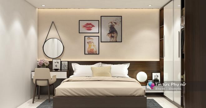 Phòng ngủ này sử dụng khá nhiều chi tiết gỗ, nổi bật là mảng tường ốp gỗ được khắc họa tiết phía bên trên giường ngủ. Hai bên đầu giường đều được thiết kế kệ để đồ thấp giúp chủ nhân thoải mái để sách báo, điện thoại,...