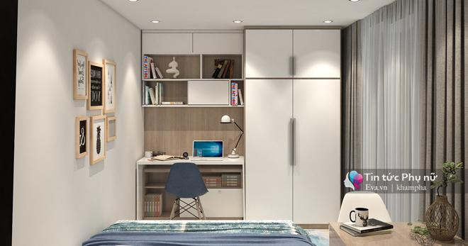 Một góc phòng là bàn làm việc và giá sách, tủ để đồ nhỏ gọn.