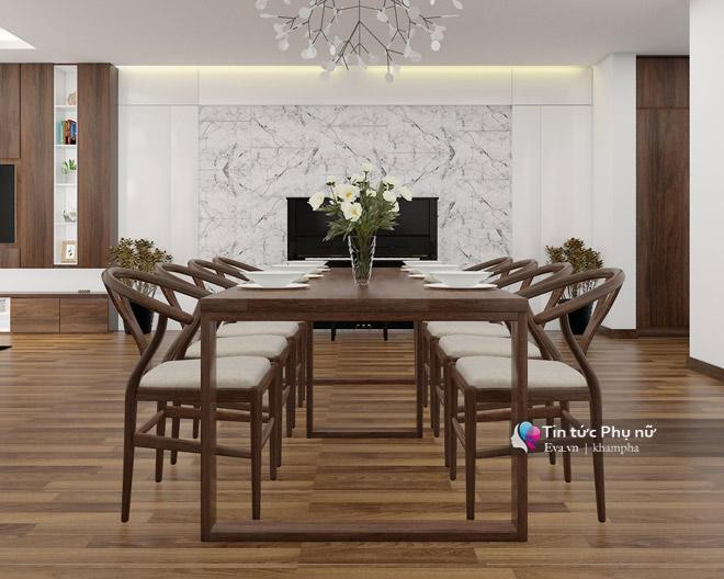 Bàn ăn lớn dành cho 8-10 người được đặt ở một khu vực rộng rãi sát bếp và phòng khách. Mảng tường trắng đối diện bàn ăn khiến không gian trở nên rộng rãi bất ngờ.