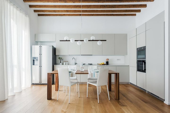 Chất liệu bàn bằng gỗ không tỏ ra lạc lõng với không gian nội thất màu trắng, bởi đơn giản là màu và chất liệu của gỗ sẽ tạo nên sự liên kết đặc biệt với sàn nhà bên dưới.