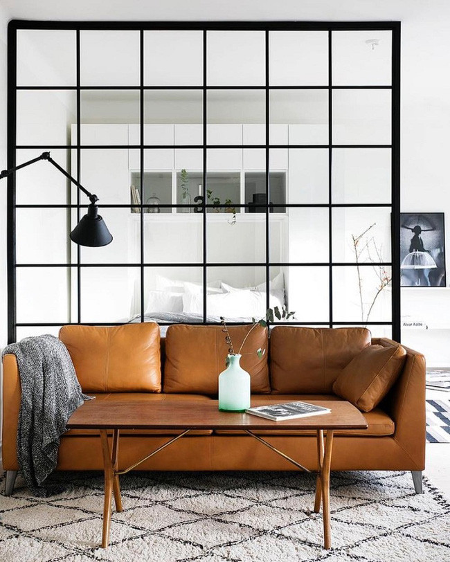 Phòng khách của ngôi nhà nhìn thẳng vào phòng ngủ chỉ qua một tấm gương ngăn cách. Chắc có lẽ đây cũng chưa được gọi là sự ngăn cách theo nghĩa đen tốt nhất nhỉ.