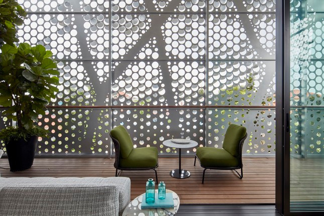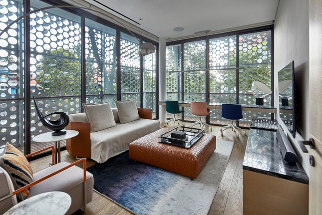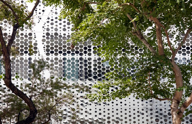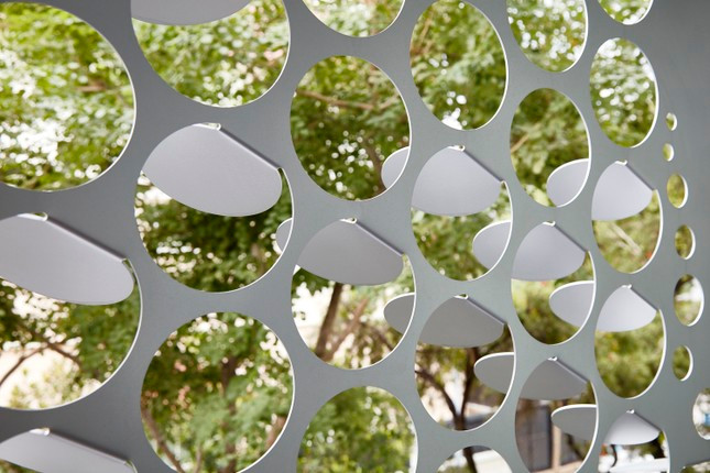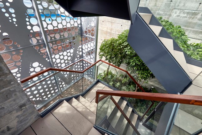 | Yêu cầu của gia chủ trong quá trình thiết kế là làm sao để hạn chế ánh nắng gay gắt hướng Tây và hướng Đông lọt sâu vào không gian sống, nhất là vào sáng sớm và chiều muộn khi gió biển thổi mạnh. Bởi vậy, nhóm thiết kế đã lựa chọn hệ lam nhôm khoét lỗ có thể đóng mở tự động, vừa giúp giảm bức xạ mặt trời, tăng khả năng thông gió tự nhiên, lại vừa tạo ấn tượng "chất chơi" cho mặt tiền. |