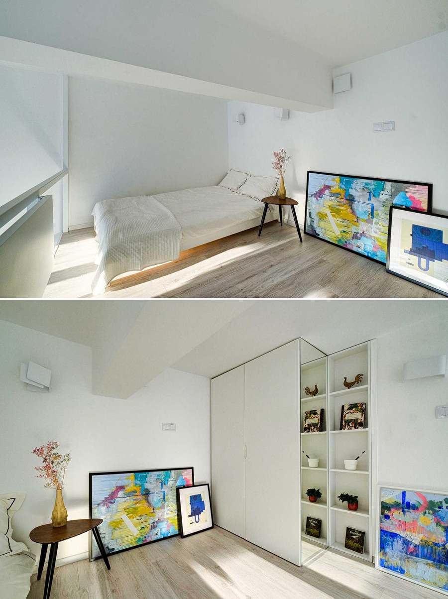 Phòng ngủ được bài trí đơn giản với giường, bàn phụ và tác phẩm nghệ thuật cũng như tủ quần áo, kệ để đồ cao kịch trần.