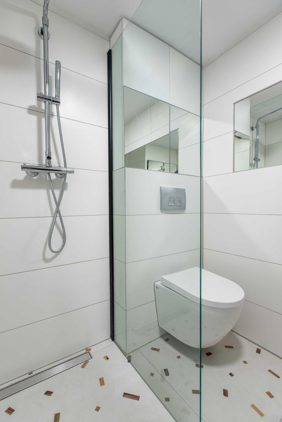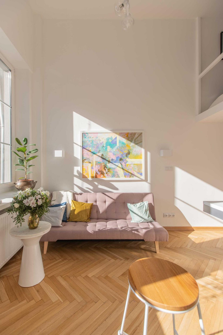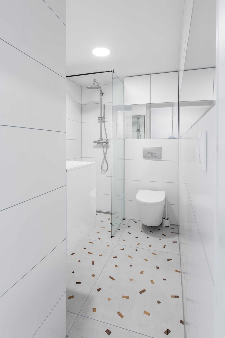 Nằm bên dưới phòng ngủ và phía sau nhà bếp căn hộ đẹp này là phòng tắm. Những bức tường trắng giữ cho không gian nhỏ thêm tươi sáng, trong khi những mảng sáng trên sàn lại tạo thêm một yếu tố đầy màu sắc.