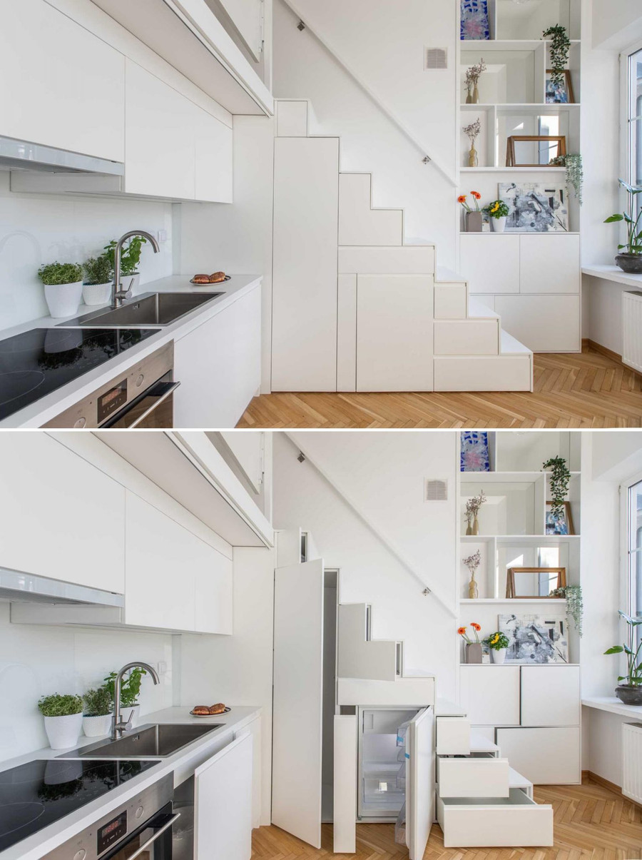 Tủ đựng thức ăn, ngăn kéo và tủ lạnh nhỏ cũng được trang bị trong tủ dưới cầu thang.