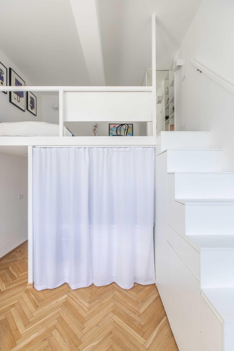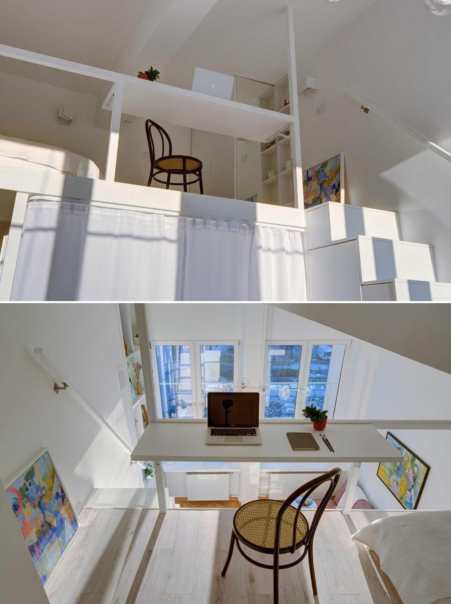 Trên gác xép ở đầu cầu thang của căn hộ đẹp này, có một bàn làm việc tích hợp lan can.