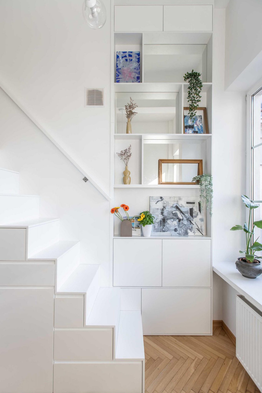 Ở dưới chân cầu thang, đội ngũ KTS đã thiết kế 1 chiếc kệ kịch trần giúp gia chủ lưu trữ đồ đạc và đồ lưu niệm hay đồ trang trí.