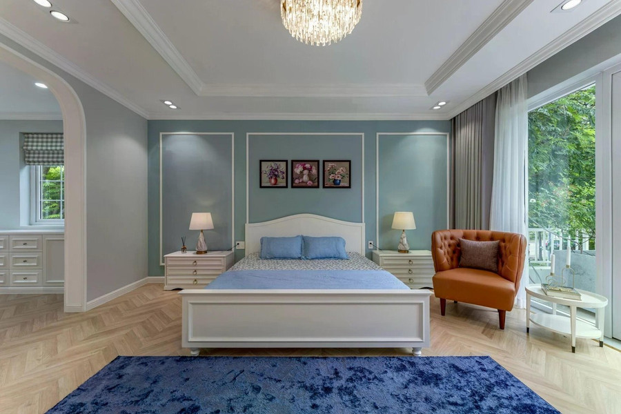 Bước vào phòng ngủ, không gian như chậm lại. Sắc xanh dịu mát được sử dụng cho mảng tường đầu giường và rèm cửa, mang đến cảm giác yên bình, thư giãn tuyệt đối. Những chiếc giường đệm bọc da hoặc vải nỉ với đầu giường tufting trần trám tạo nên vẻ sang trọng cổ điển, kết hợp cùng tranh treo tường đối xứng và ánh sáng vàng ấm từ đèn ngủ, hình thành công thức hoàn hảo cho một giấc ngủ sâu và trọn vẹn.