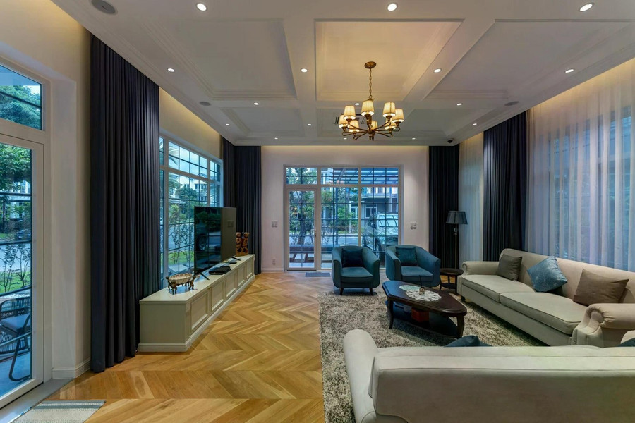 Sàn gỗ xương cá màu ấm kết hợp cùng thảm lông xù mềm mại giúp trung hòa sự mát mẻ của sắc xanh, tạo nên cảm giác ấm cúng cho phòng khách. Hệ trần giật cấp cùng đèn chùm mang hơi hướng cổ điển pha hiện đại không chỉ làm tăng chiều sâu không gian, mà còn khẳng định gu thẩm mỹ tinh tế của gia chủ. Mỗi chi tiết đều được cân nhắc để tạo nên một không gian tiếp khách vừa sang trọng, vừa gần gũi.