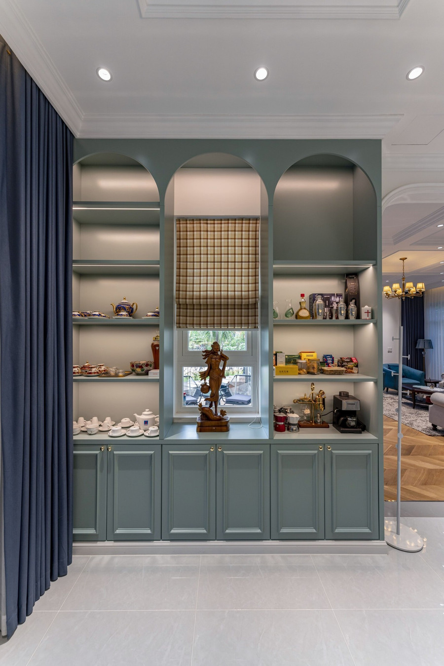 Ngay từ phòng khách – trái tim của ngôi nhà – người xem dễ dàng bị cuốn hút bởi bảng màu tinh tế. Tông be và xám nhạt của sofa tạo nền trung tính, làm nổi bật những điểm nhấn xanh lam và xanh lục bảo đậm từ ghế armchair và rèm cửa. Sắc xanh không chỉ đóng vai trò trang trí, mà còn mang lại cảm giác thư thái, cân bằng thị giác, giúp không gian trở nên dịu mắt và dễ chịu ngay khi bước vào.