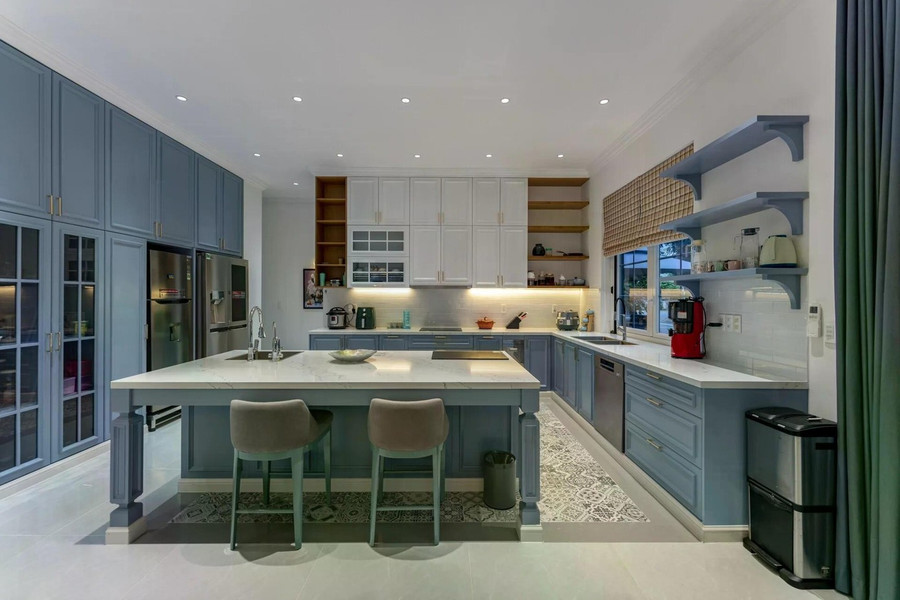 Không gian bếp – bàn ăn tiếp nối mạch cảm xúc ấy với cách thiết kế mở, tối ưu ánh sáng và sự kết nối. Sắc xanh tiếp tục được sử dụng ở tủ bếp dưới và các mảng tủ đứng cao với tông blue-gray pastel dịu mát, tương phản tinh tế với hệ tủ trên màu trắng. Sự kết hợp này mang lại cảm giác sạch sẽ, hiện đại nhưng không hề lạnh lẽo hay đơn điệu.