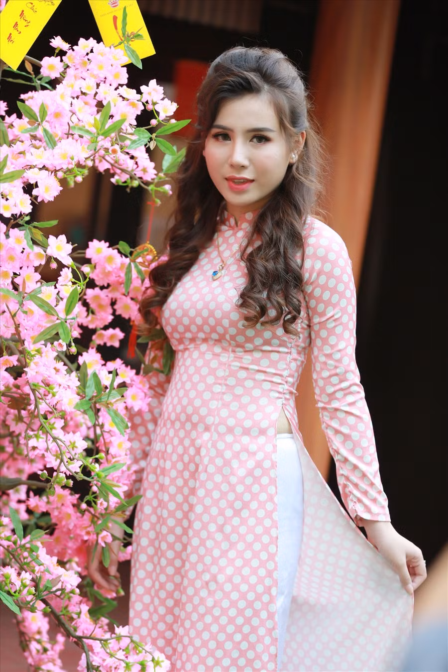 Bên cạnh mai vàng, những cành đào hồng thắm cũng là hậu cảnh được các thiếu nữ ưa thích để lưu lại bức ảnh ngày xuân.