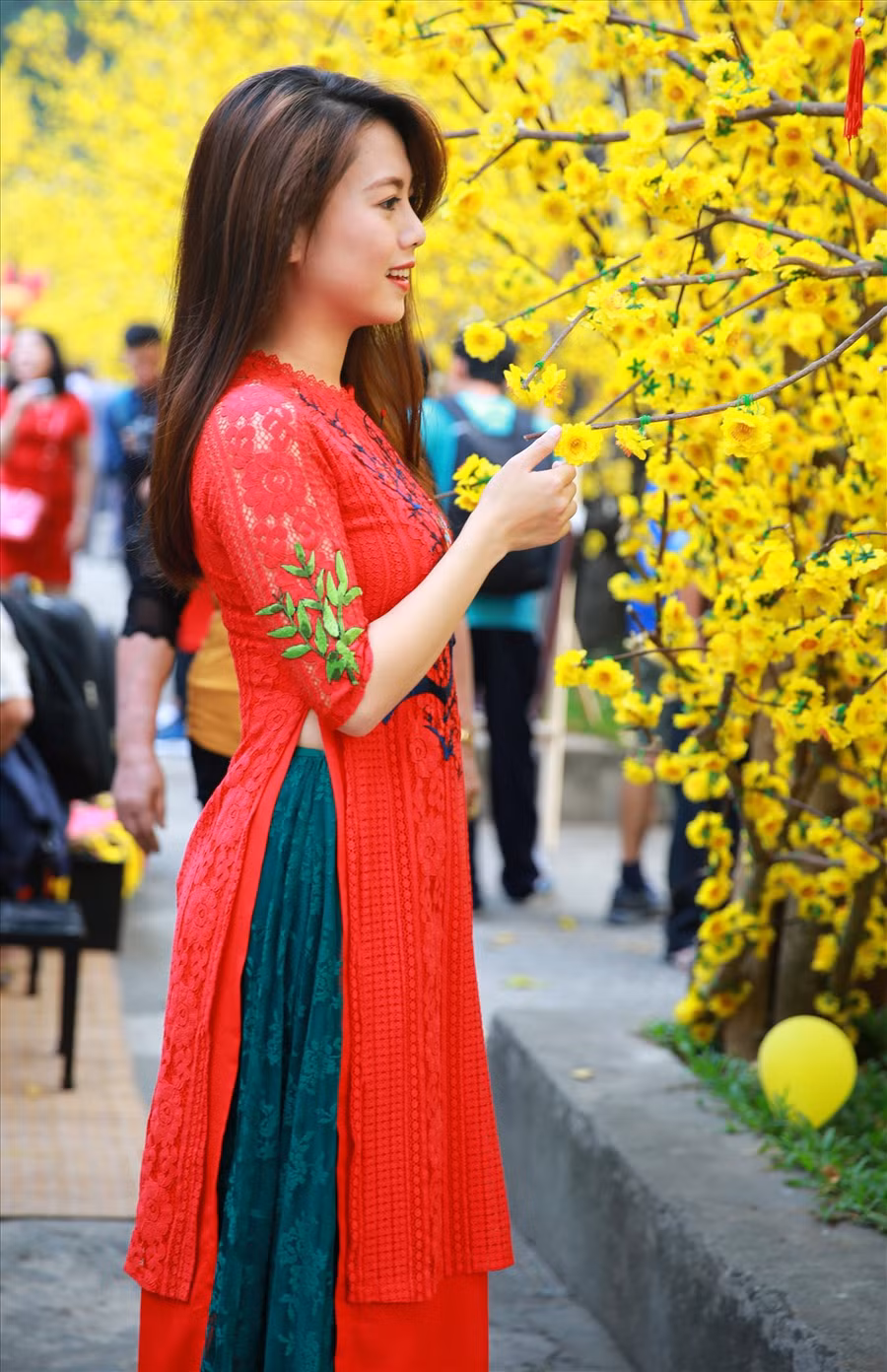 Một số thiếu nữ tranh thủ cùng bạn bè thướt tha trong bộ áo dài cách tân, thả dáng tự tin, tươi trẻ bên hoa mai, cành đào chụp ảnh lưu niệm trên "phố Ông Đồ” khiến người xem thực sự bị cuốn hút.