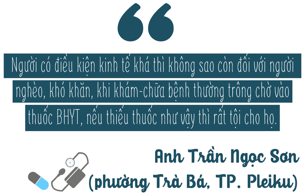 Đưa mẹ đến khám tại Bệnh viện Đa khoa tỉnh, chị Trần Thị Hồng (tổ 5, phường Hội Thương, TP. Pleiku) chia sẻ: Mẹ chị bị bệnh tim, huyết áp, thấp khớp và một số bệnh khác. Mỗi tháng, chị đưa mẹ đến Bệnh viện Đa khoa tỉnh khám 1-2 lần. Những lần khám bệnh trước, thuốc rất đầy đủ. Tuy nhiên, hơn 1 tháng trở lại đây, mẹ chị thường xuyên bị thiếu thuốc. Một số loại thuốc tim mạch như: DigoxineQualy 0,25 mg trị suy tim, thuốc Aspirin, thuốc bổ não… hầu như không có, phải mua ngoài. “Bác sĩ nói do các loại thuốc này chưa có nên kê loại thuốc tương tự thay thế. Tuy nhiên, một số loại thuốc bệnh viện không có, cũng không có thuốc tương tự thay thế nên tôi phải ra ngoài mua cho mẹ uống. Việc thiếu thuốc chỉ tạm thời thì không sao nhưng nếu tình trạng này kéo dài thì sẽ ảnh hưởng đến quyền lợi của người tham gia BHYT. Tôi mong các bệnh viện quan tâm mua sắm đầy đủ các loại thuốc đáp ứng nhu cầu khám-chữa bệnh cho người dân, trong đó có người tham gia BHYT”-chị Hồng bộc bạch.