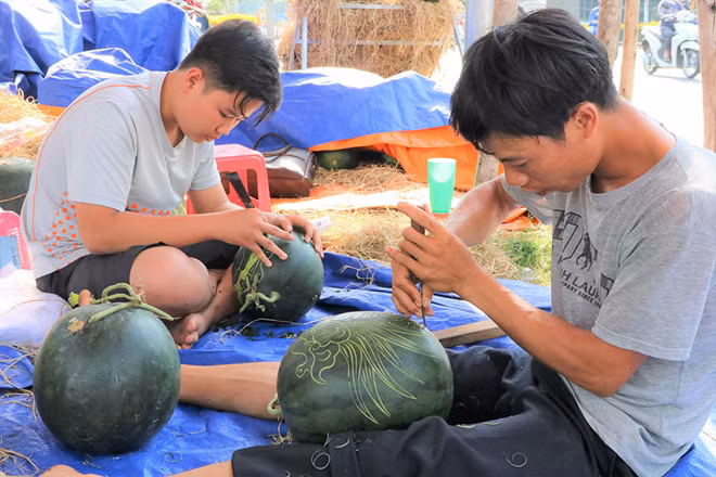 'Mình được chủ vựa dưa thuê làm công việc này với mức tiền khoán là 1 triệu đồng/ngày, dù ngày đó có khách nhiều hay ít thì họ vẫn phải trả cho mình đúng với số tiền đã cam kết', anh Quảng (thợ khắc dưa hấu) nói.
