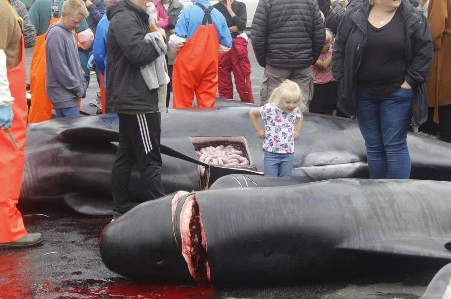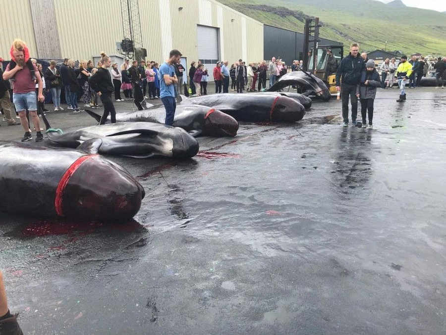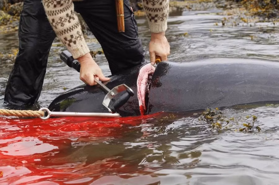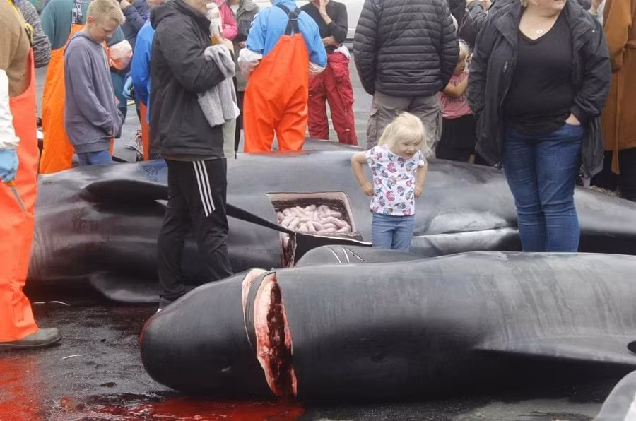 Theo truyền thống ở quần đảo Faroe, 23 con cá voi hoa tiêu bị giết để lấy thịt và mỡ, trong đó có cả những con cá voi đang mang thai. Con non cũng bị cắt khỏi bụng mẹ, theo The Sun.