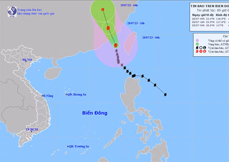 Sau đó, bão di chuyển theo hướng Bắc Tây Bắc với tốc độ 20 km/giờ. Đến 16 giờ ngày 28/7, vị trí tâm bão ở vào khoảng 25,9 độ Vĩ Bắc, 117,8 độ Kinh Đông. Sức gió mạnh nhất vùng gần tâm bão mạnh cấp 8, giật cấp 10. Vùng nguy hiểm do ảnh hưởng của bão: phía Bắc vĩ tuyến 20,5 độ Vĩ Bắc; phía Đông kinh tuyến 116 độ Kinh Đông. Khu vực phía Đông Bắc của Bắc Biển Đông có cấp độ rủi ro thiên tai cấp 3. Bão tiếp tục di chuyển với tốc độ 20 km/giờ theo hướng Bắc Tây Bắc và suy yếu dần. Đến 4 giờ ngày 29/7, vị trí bão đã suy yếu ở vào khoảng 28,6 độ Vĩ Bắc, 117 độ Kinh Đông; gió mạnh nhất dưới cấp 6.