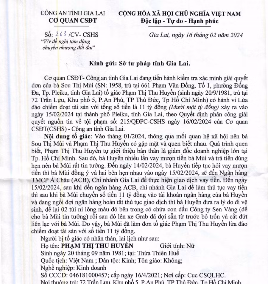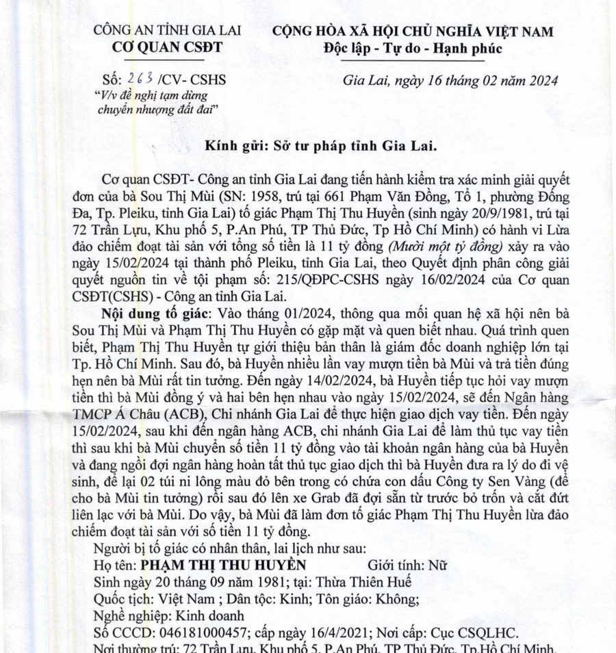 Theo quyết định phân công giải quyết nguồn tin về tội phạm, Cơ quan Cảnh sát điều tra Công an tỉnh Gia Lai đang tiến hành xác minh, giải quyết đơn của bà Sou Thị Mùi (SN 1958, trú TP. Pleiku) tố giác Phạm Thị Thu Huyền có hành vi lừa đảo chiếm đoạt số tiền 11 tỷ đồng, xảy ra vào ngày 15-2-2024, trên địa bàn TP. Pleiku. Nội dung đơn tố giác là vào tháng 1-2024, thông qua mối quan hệ xã hội, bà Sou Thị Mùi và Phạm Thị Thu Huyền có gặp mặt và quen biết nhau. Quá trình quen biết, Phạm Thị Thu Huyền tự giới thiệu bản thân là giám đốc doanh nghiệp lớn tại TP. Hồ Chí Minh.