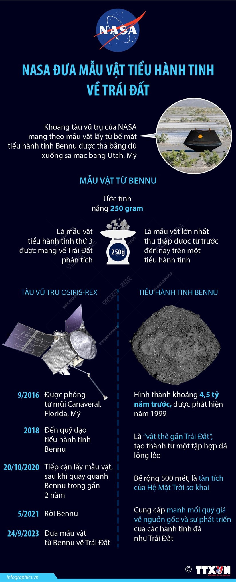 Ngày 24/9 (giờ địa phương) tức sáng ngày 25/9 (giờ Việt Nam), một khoang của tàu vũ trụ OSIRIS-Rex thuộc Cơ quan Hàng không và Vũ trụ Mỹ (NASA) đã được thả bằng dù xuống sa mạc bang Utah của Mỹ, mang theo mẫu vật lấy từ bề mặt tiểu hành tinh Bennu gần Trái Đất.