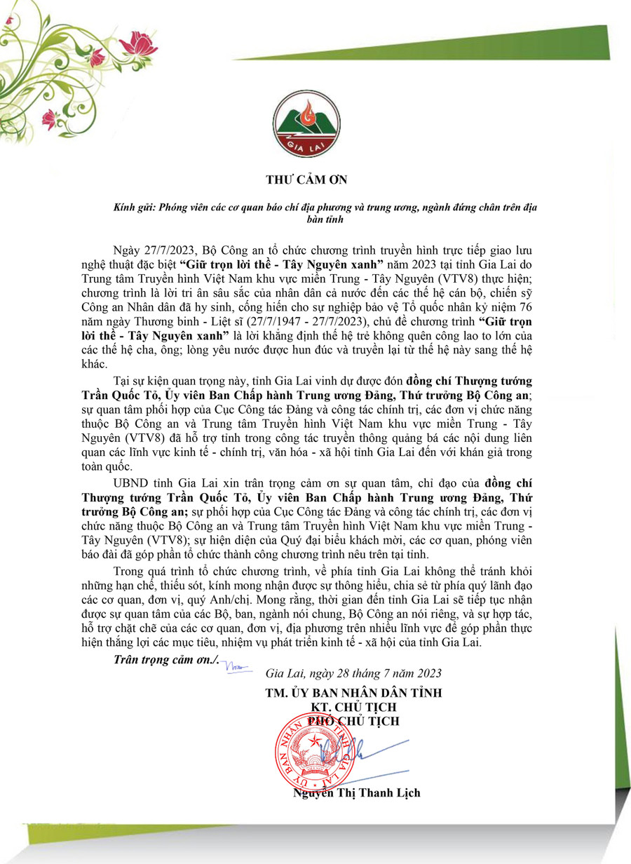 (GLO)- Ủy ban nhân dân tỉnh Gia Lai trân trọng cảm ơn.