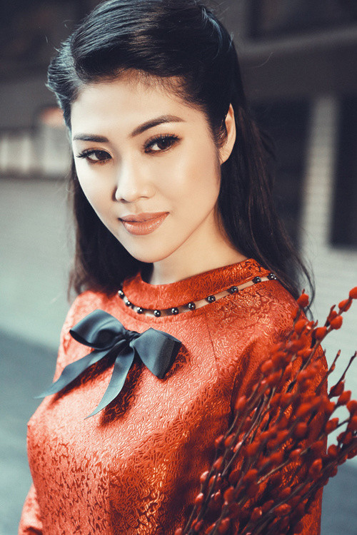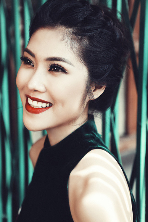 Với bộ đồ trầm màu, người đẹp vấn tóc cao, tô son đỏ để tạo vẻ sang trọng.