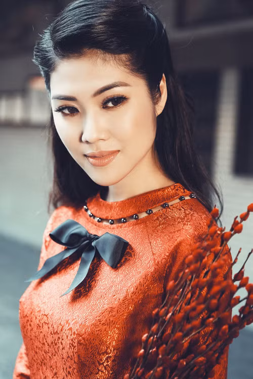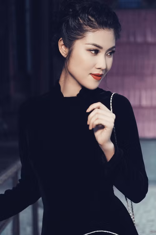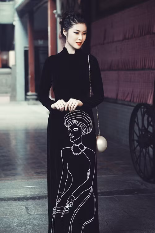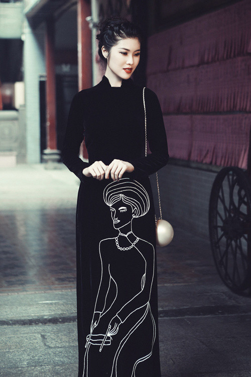 Khi muốn có vẻ ngoài cổ điển và trưởng thành, Thu Hằng diện áo dài đen in họa tiết trắng. Cô phối trang phục cùng túi xách hình ngọc trai.