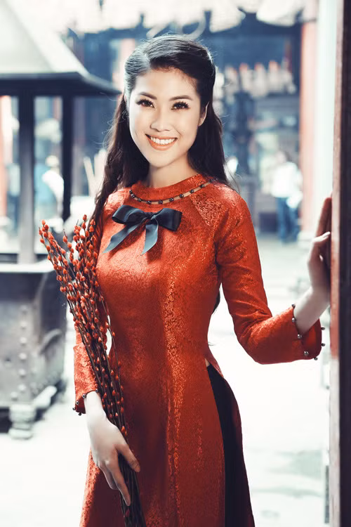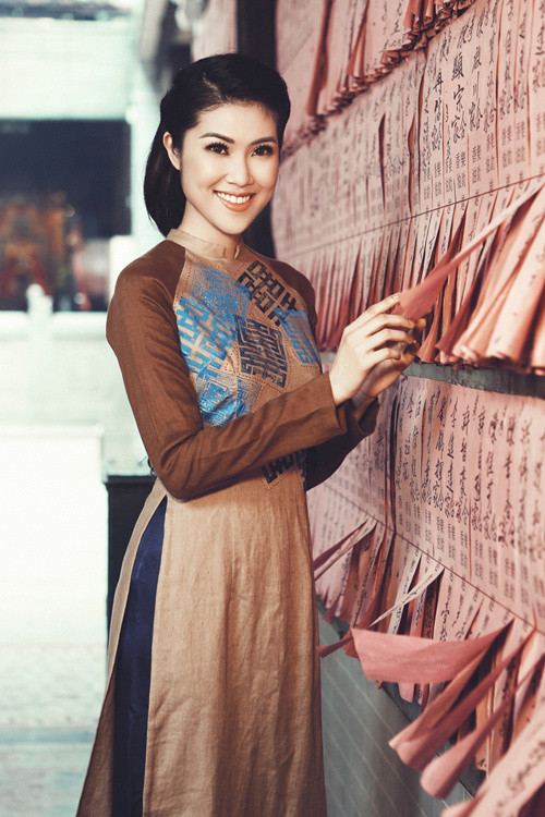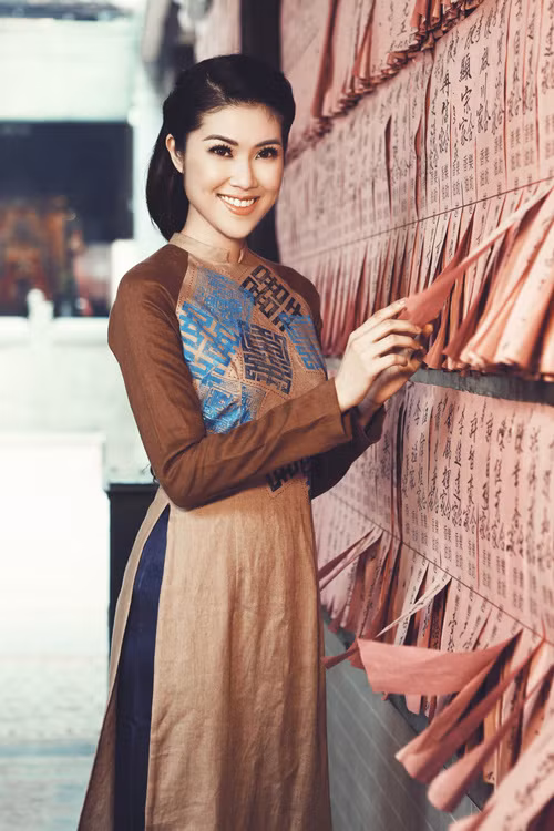 Người mẫu khoe nét dịu dàng trong áo dài nâu in chữ song hỷ.