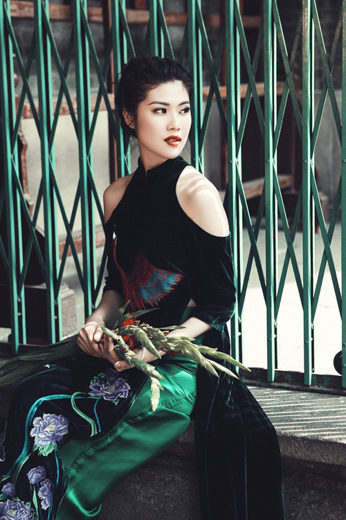 Tà áo truyền thống được cách điệu ở cổ và vai, đem lại vẻ quyến rũ cho người mẫu khi dạo phố.