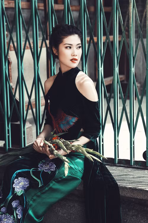 Kiểu khoét vai vốn đang thịnh hành trên các mẫu váy dạo phố của phái đẹp hai miền. Trong bộ ảnh mới, Thu Hằng diện mẫu áo dài kết hợp lối cắt cúp này.