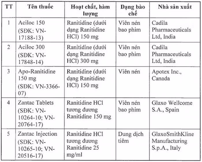 Cụ thể gồm các loại thuốc sau: Thuốc Aciloc 150 (số đăng ký: VN-17188-13) và thuốc Aciloc 300 (SĐK: VN-17848-14), dạng bào chế viên nén bao phim, công ty Cadila Pharmaceuticals Ltd (Ấn Độ) sản xuất; thuốc Apo-Ranitidine 150mg (SĐK: VN-3366-07), dạng viên nén, do Apotex Inc của Canada sản xuất; thuốc Zantac Tablets (SĐK: VN-10264-10, VN-20764-17), dạng viên nén bao phim, do Glaxo Wellcome S.A của Tây Ban Nha sản xuất;