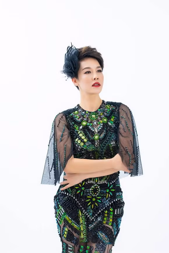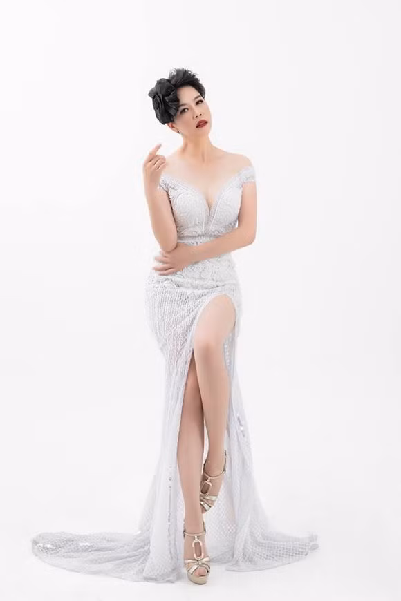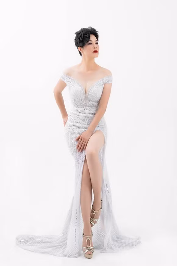 Bộ đầm dạ hội khoét sâu phô diễn những đường nét gợi cảm, bên cạnh bộ tóc ngắn cá tính - Thu Phương quá trẻ trung so với độ tuổi 46 của mình.